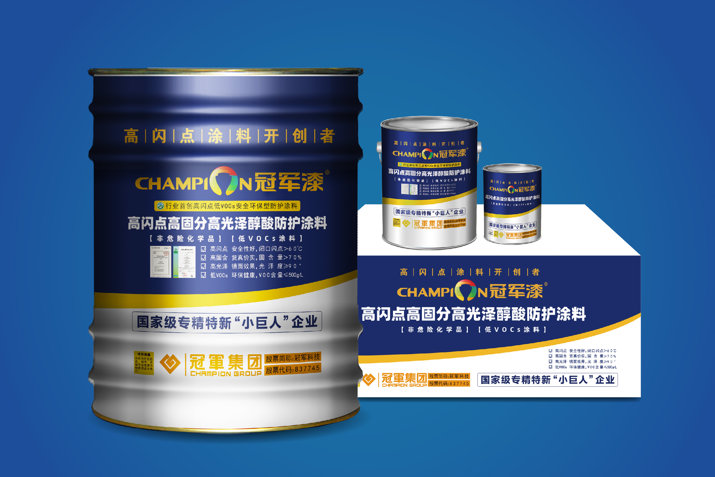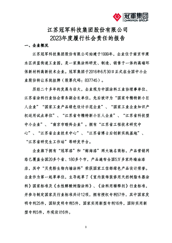 江蘇冠軍科技集團股份有限公司創(chuàng)建于1999年,經(jīng)過創(chuàng)業(yè)團隊20年的努力奮斗,集團已成為國內(nèi)著名的、以工業(yè)涂料研發(fā)、生產(chǎn)、銷售為一體的高科技企業(yè)。2016年6月30日,冠軍集團在全國中小企業(yè)股份轉(zhuǎn)讓系統(tǒng)掛牌(股票代碼:837745)。